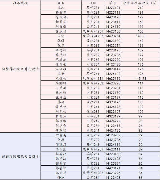 经个人申请,学院审核,以本年度志愿服务折算总时长为主要依据,拟推荐王玲等27名本科同学申请南京农业大学优秀志愿者,尹春美等10名本科同学为麻豆视频 优秀志愿者: