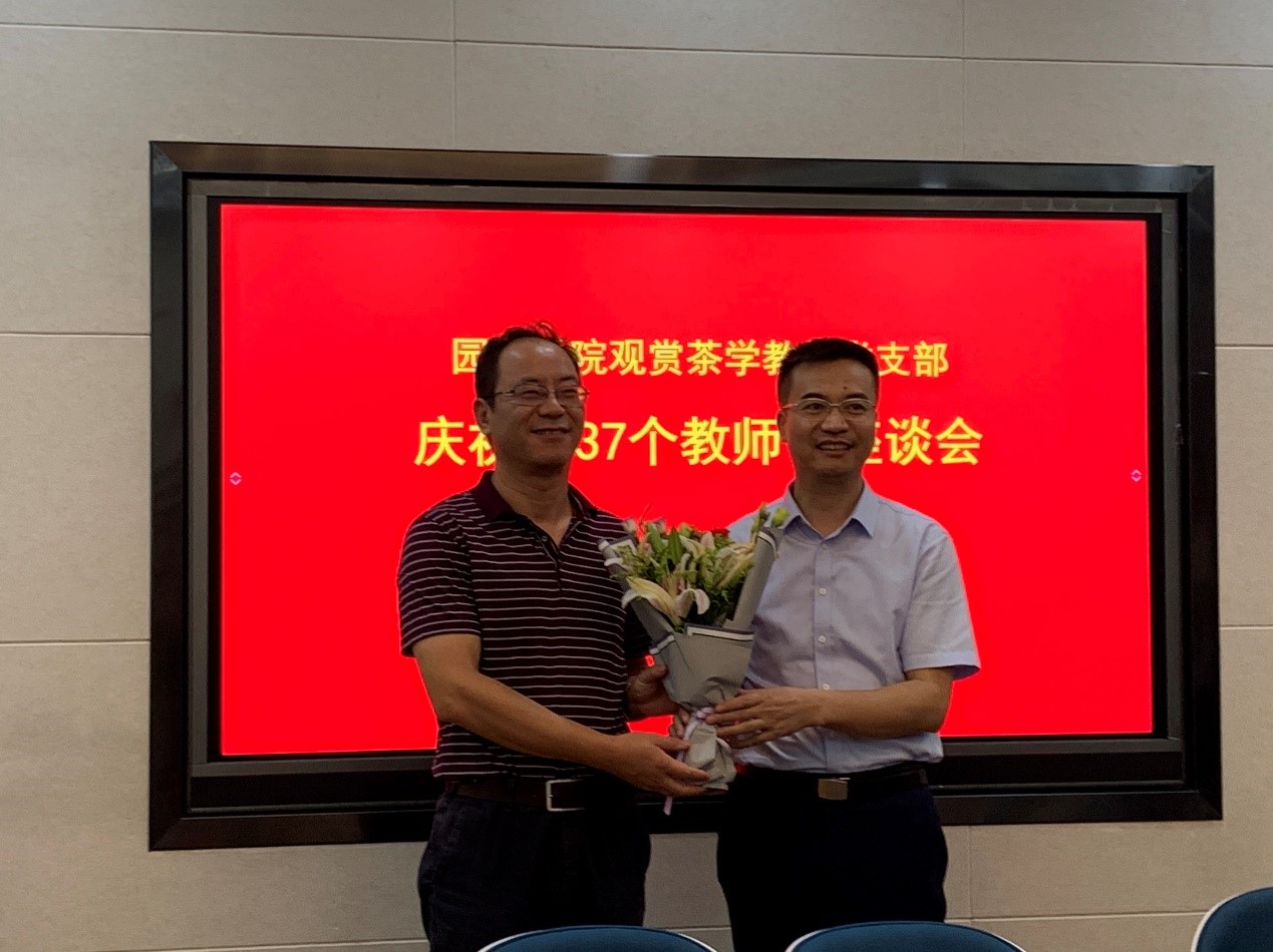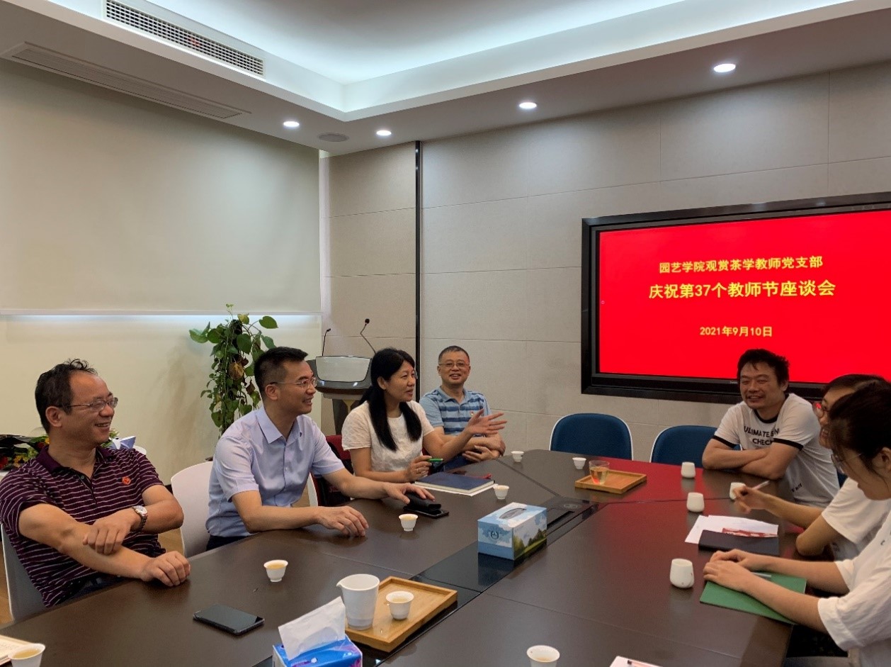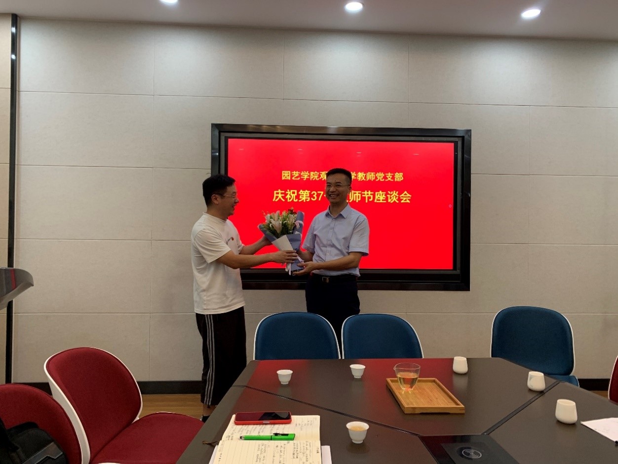 专业教师党支部举办庆祝第37个教师节座谈会。会议邀请了南京农业大学校长、九三学社江苏省委副主委陈发棣教授,九三学社社员代表管志勇教授以及观赏学科丁宝清、王振兴、王利凯3位新入职教师参会。
