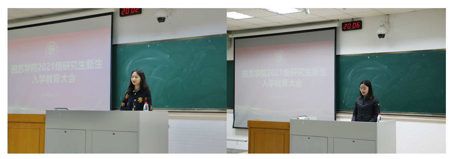 紧接着,由新老生代表分别进行发言。老生代表2020级观赏园艺专硕沈妍向新生们分享了她的学习思考,建议新生们建立自信,重视学习,放手去做,走出没有局限的人生。新生代表2021级果树学博士朱晓璇与大家共同探讨了自己的规划,作为果树学博士研究生她将努力让梨花更美、梨果更甜、梨农更富。