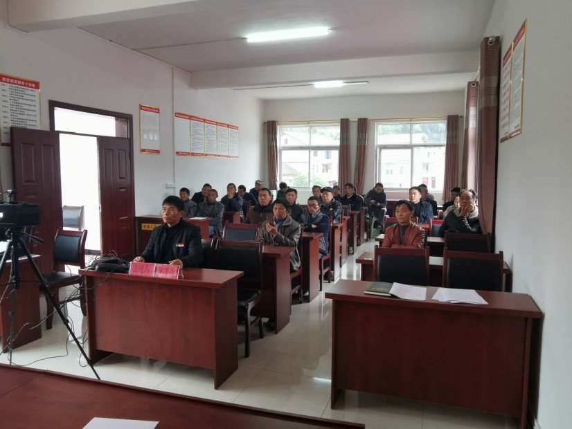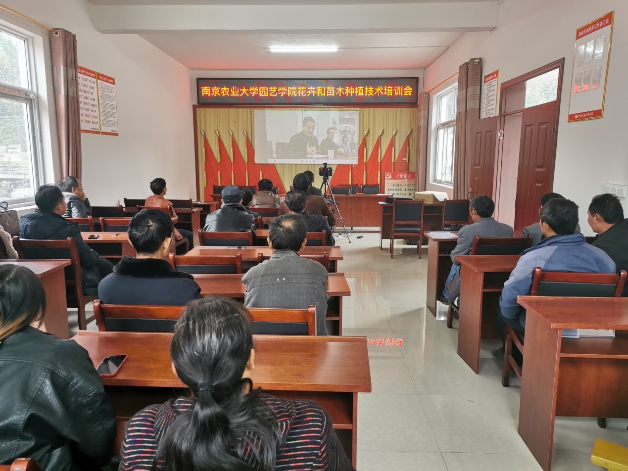 会前,学院与谷羊村委进行了交流,征集了谷羊村在产业发展过程中遇到的困难和瓶颈。针对谷羊村发展“红花檵木”等绿化苗木过程中遇到的问题,管志勇教授做了题为“苗木培育关键技术”的专题培训。他从红花檵木的品种特点、生活习性、繁殖栽培事项到育苗基质配比、施肥养护等方面进行系统的讲授。33名参加培训人员认真聆听了学习技术讲座。