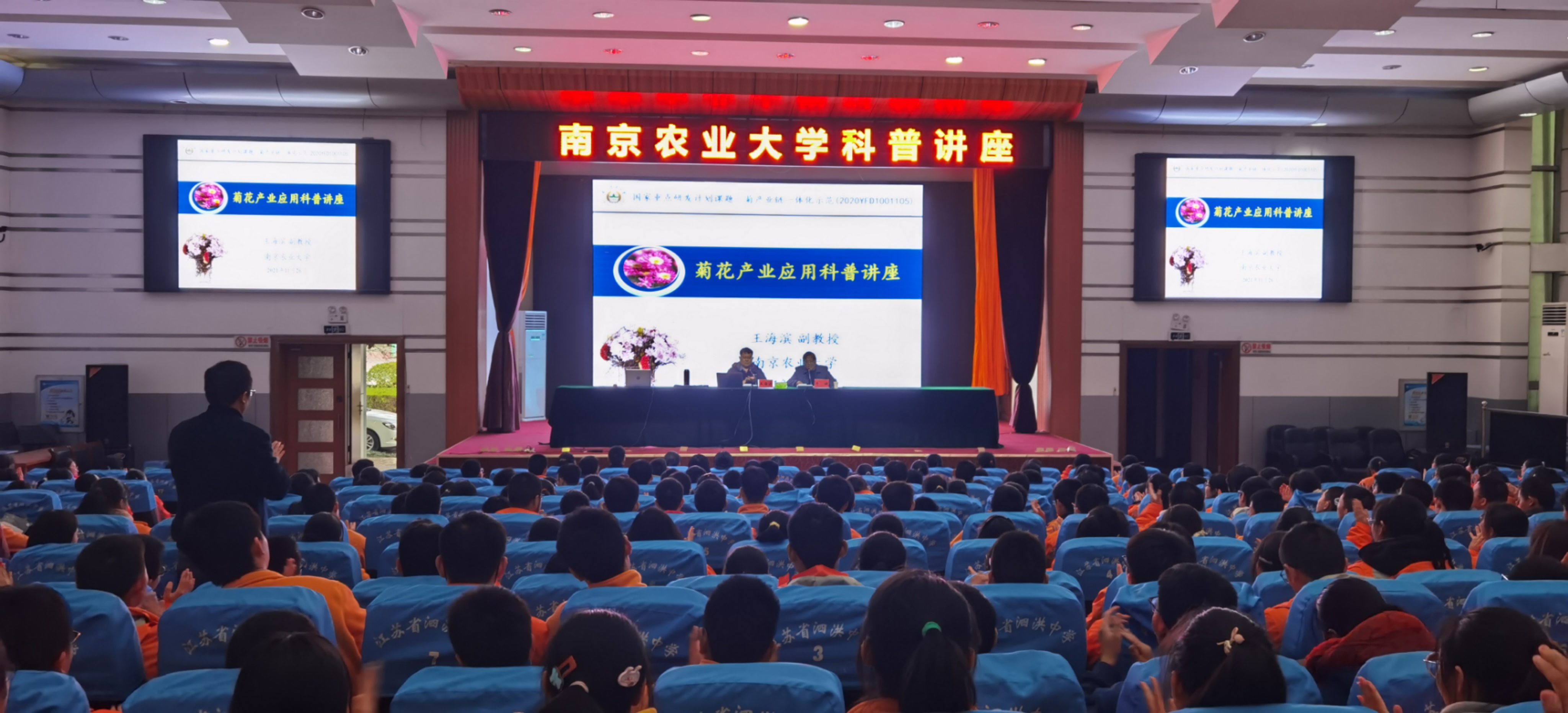 在泗洪中学,王海滨为700余名学生作了题为《菊花产业应用科普》的知识讲座。王老师从“采菊东篱下,悠然见南山”的菊花文化开始,讲述了菊花在花卉产业中的地位及观赏、药用、食用价值等,展示了各色菊花新品种,说到了南京农业大学在菊花品种的收集、选育、应用及菊花衍生品的研发。最后,王老师从南农的学术地位、学科及专业设置等方面介绍了南京农业大学,在“南农知多少”的互动抽奖环节,赠送了学生菊花口红及护手霜,将活动氛围拉到了高潮,也使泗洪中学学生对我校有了更深入的了解。