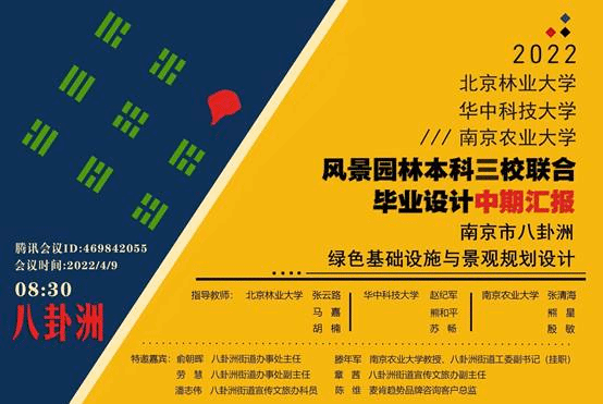4月9日上午,由南京农业大学联合北京林业大学、华中科技大学共同参与的联合毕业设计“南京市八卦洲绿色基础设施与景观规划设计”中期汇报于线上顺利举行。来自三所院校的33位师生和南京八卦洲街道办事处主任余朝晖、街道工委副书记麻豆视频
