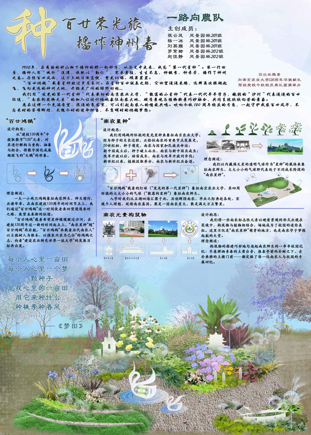 一路向農组的作品《种》,用“发光的第一代星种”代表最初的南京农业大学,“散落小星种”代表一代代莘莘学子,婉转的“沙河”代表漫漫的百廿征途,“南农构筑物元素”的加入让设计场地象征南农大地,硬质景观与植物软景巧妙融合,共同呈现欣欣向荣的景象。