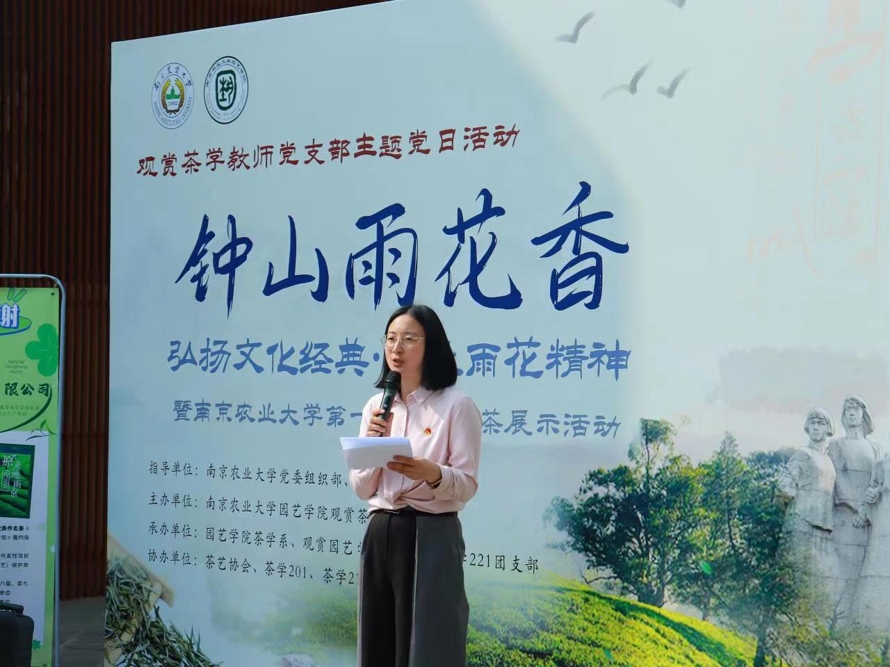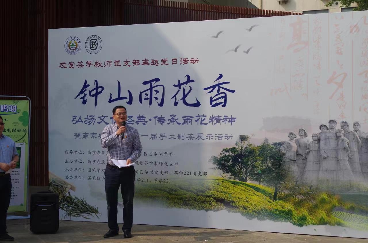 园艺院党委书记韩健从我国源远流长的茶历史和文化展开,他回顾了我校茶学学科专业的历史与发展。随后,他重点介绍了雨花茶的由来,带领青年师生重温雨花英烈精神。“雨花茶”于 1959年春创制成功,制成“形如松针,翠绿挺拔”的茶叶产品,以此来意喻革命烈士忠贞不屈、万古长青,使人饮茶思源,表达对雨花台革命烈士的崇敬与怀念。同时雨花茶也蕴含着深厚的茶历史文化内涵,很好地体现了工匠精神、匠心精神。因此雨花茶是一款纪念和缅怀革命烈士的茶,也是一款爱国茶。习近平总书记在江苏考察期间指出:“在雨花台留下姓名的烈士就有1519名。他们的事迹展示了共产党人的崇高理想信念、高尚道德情操、为民牺牲的大无畏精神。”这就是雨花英烈精神。韩健要求青年师生珍惜今天的幸福生活,弘扬雨花英烈精神,坚定信仰,勇作时代新农人,为加快建设农业强国,推进乡村振兴,实现中华民族伟大复兴作出贡献。