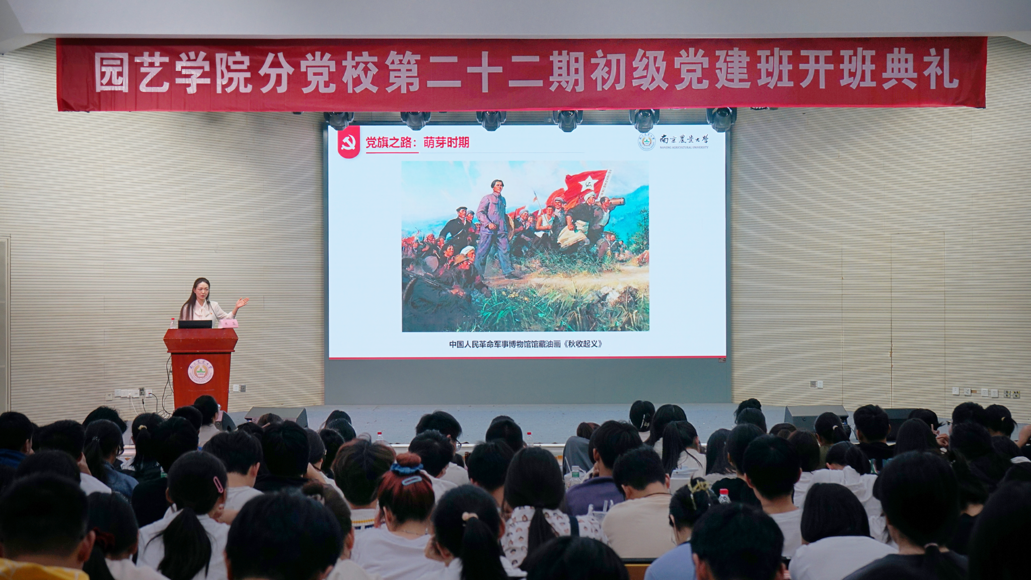 开班典礼之后,马克思主义学院副教授陈蕊给学员们带来了园思讲堂系列讲座之《党旗所指,心之所向——中国共产党党旗之路》。她以一部感人的电影《铁道游击队》为引,向同学们讲述了党旗的发展历程。我们今天看到的党旗并非自党的成立之日起就存在的,党旗从无到有直至最终定型经历了较长时间,其过程与党不断发展壮大的历史密切相关。