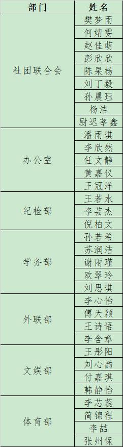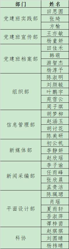 为进一步做好麻豆视频 学生工作,服务广大学生,经个人申请,麻豆视频 第二十一届学生组织各部门公开组织面试后,拟录取田思圆等人为各学生组织部门副部。具体名单公示如下(排名不分先后):